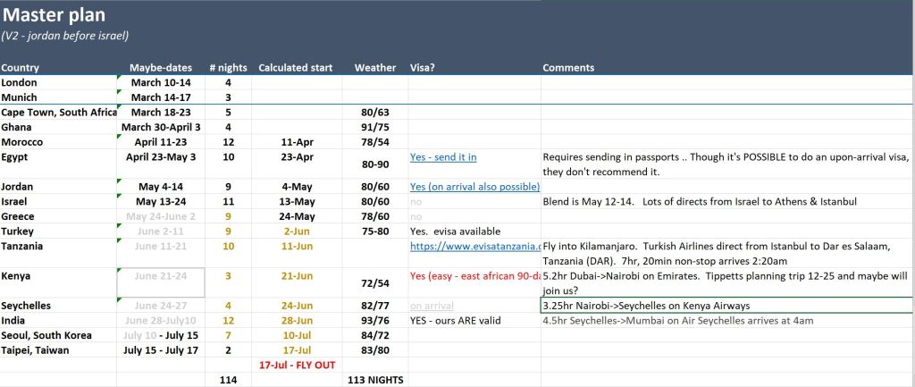 Maybe we’ll do a post on this. We’re lucky the ship creates about a month of “pre-booked travel”, and outside that mostly we’re planning on our own with a couple of travel agents helping for specific countries. Our planning process involves a LOT of ONENOTE .. and a LOT of Excel. As an example — here’s our “master plan” spreadsheet-ply as of today. Wonder how much this will change by the end…