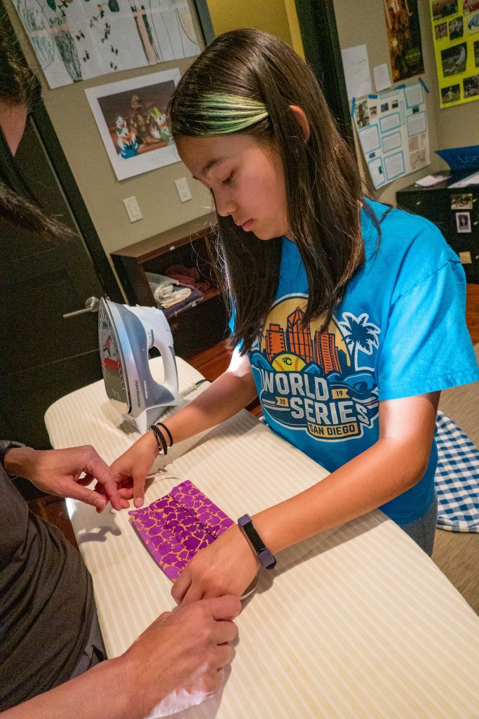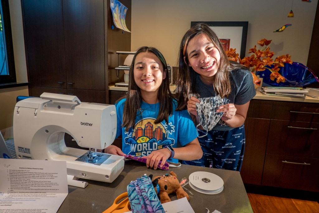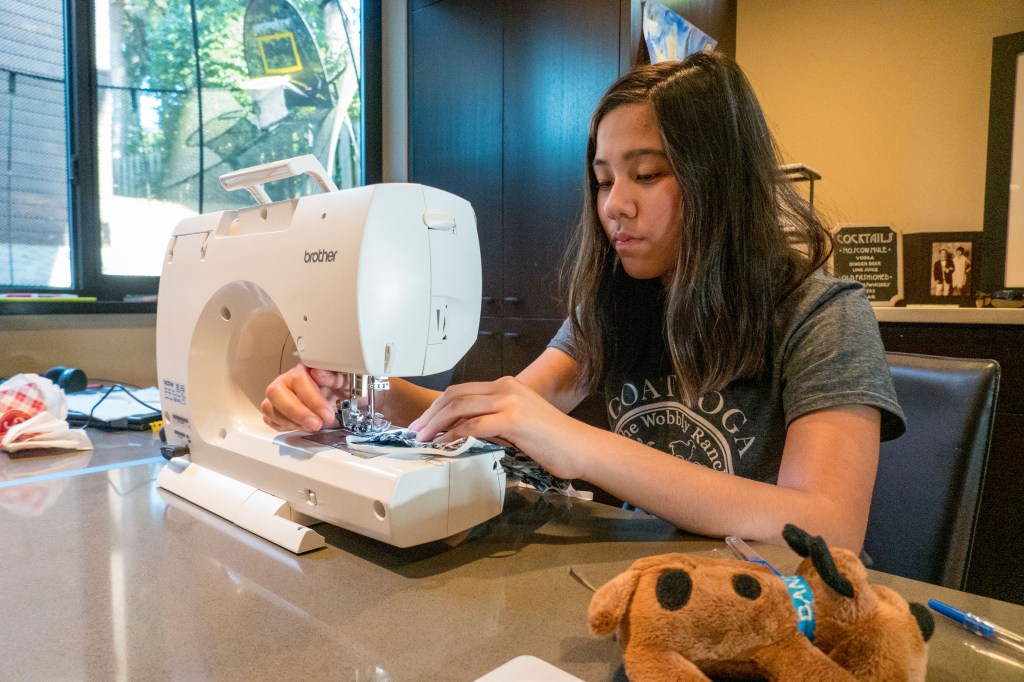 Piper and I decided we would also help people by making masks for our family and others. A family friend gave us a kit to get us going, and we borrowed a sewing machine from Lorrie. Each time we made a mask, we started out by sewing two pieces of fabric inside-out and then flip them right-side in. Next, we iron it and we put in “pin folds”. And last, we use a sewing machine to sew around the outside of the mask twice.