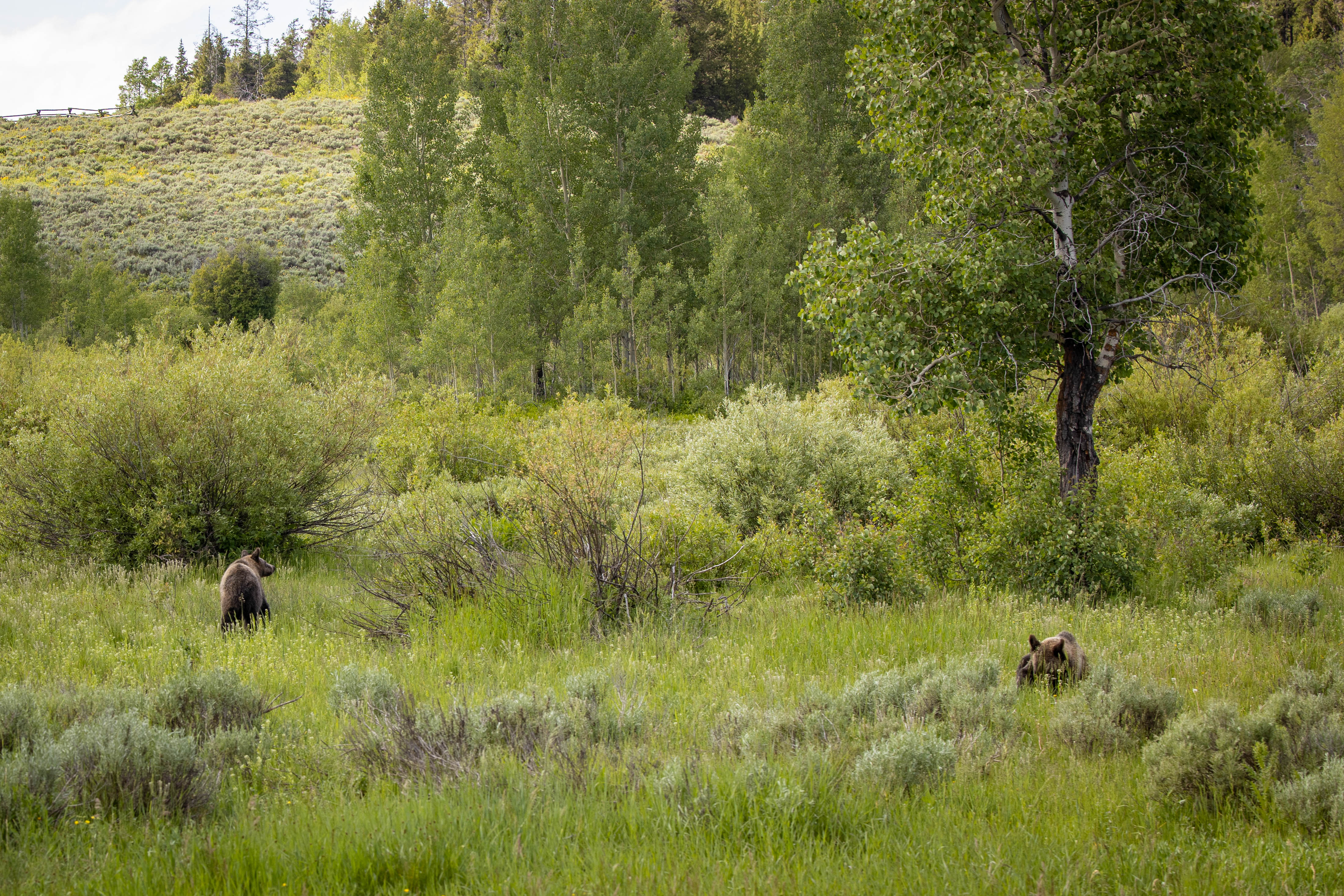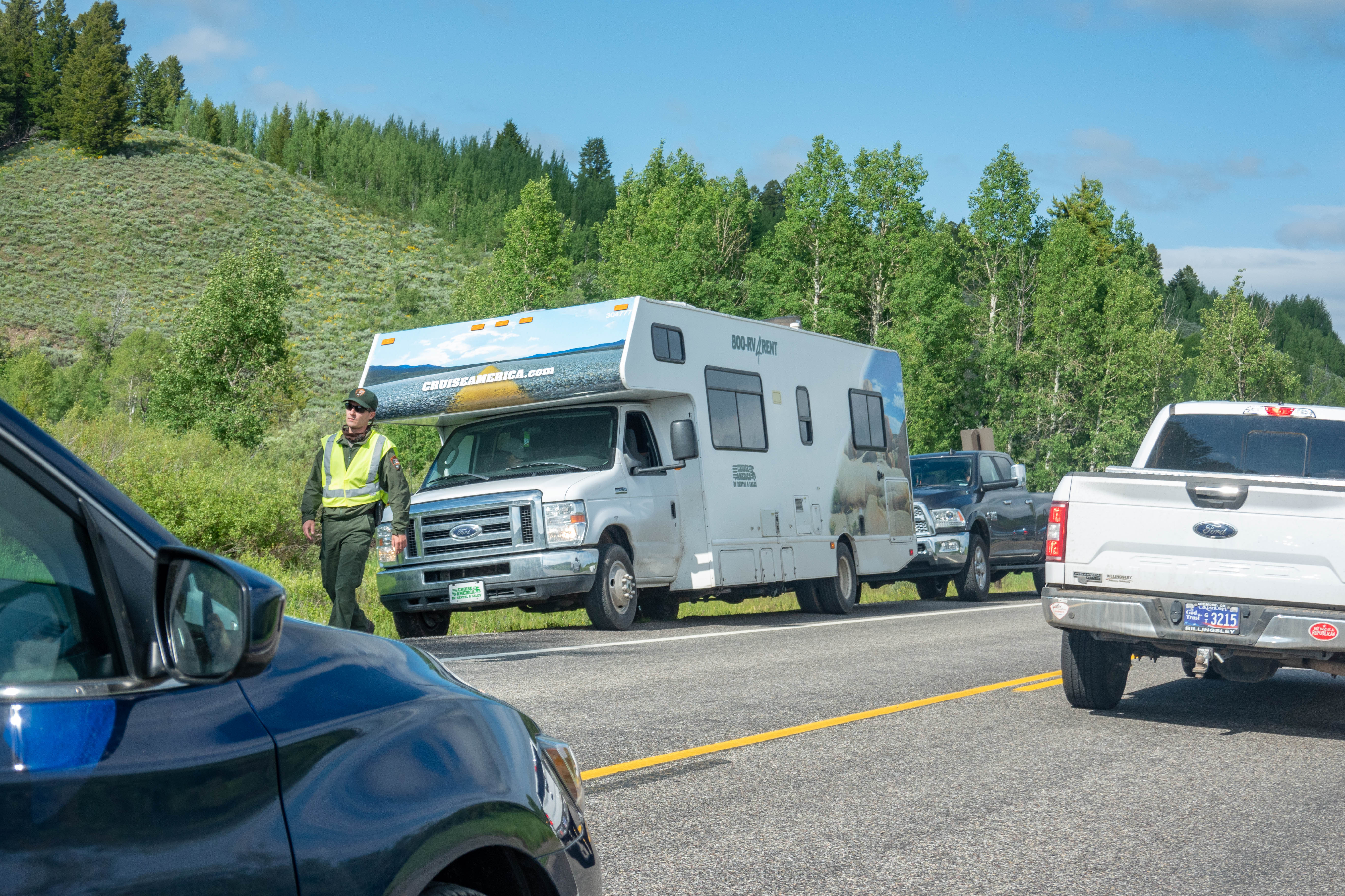At Grand Teton — much like Yellowstone– Sometimes you’re just driving through the park… and suddenly there’s bedlam because… somebody spotted a bear! The traffic grinds to a halt, cars line the road, the rangers and volunteers start walking the roadside giving instructions.. and they even pull an ambulance up… just in case.