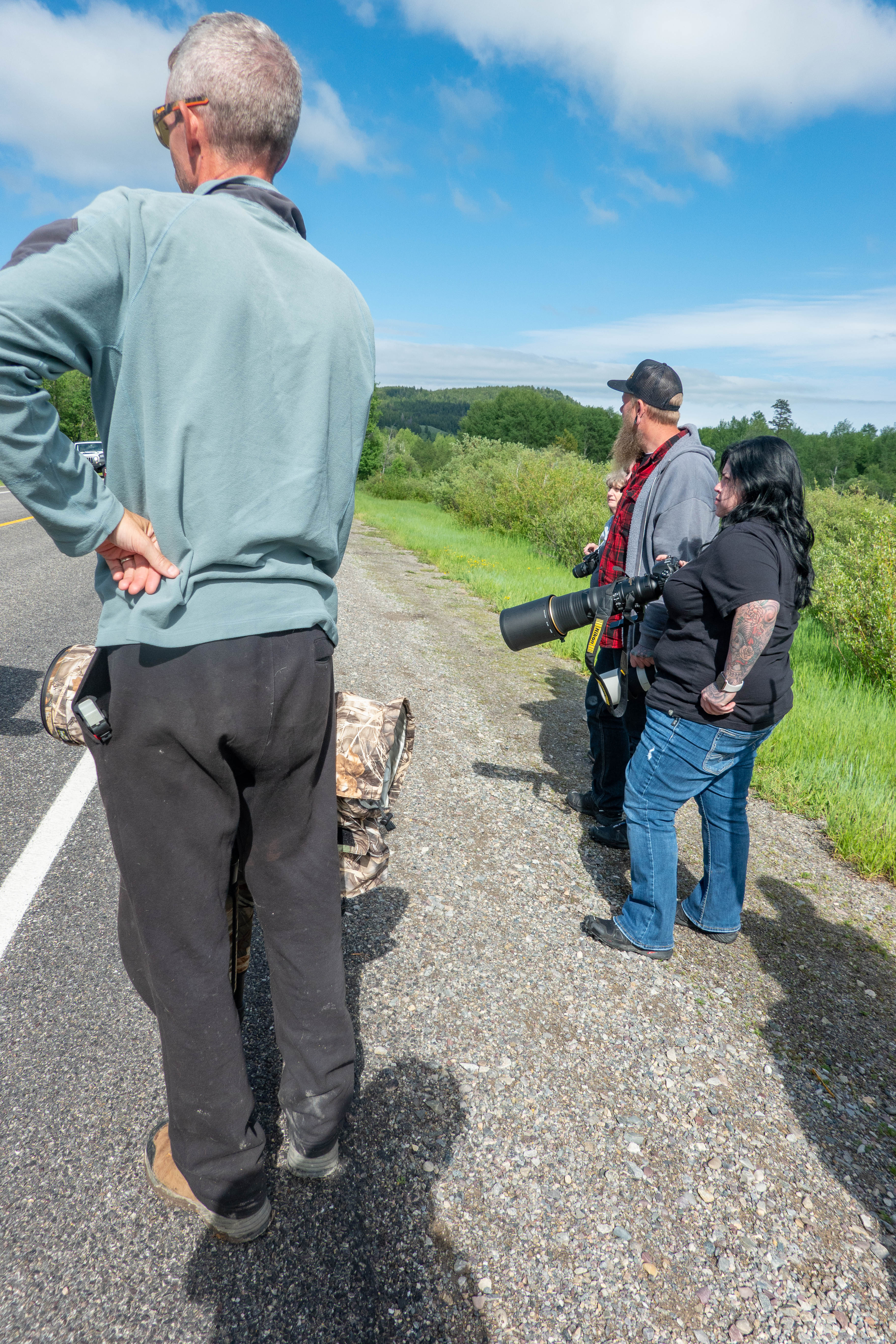 The scene below happened when “Grizzly 610 and her cub” happened to be on the side of the road. We got just one glance before parking… then … nothing. Felt like fishing! Note the serious camera gear some of these folks are sporting…
